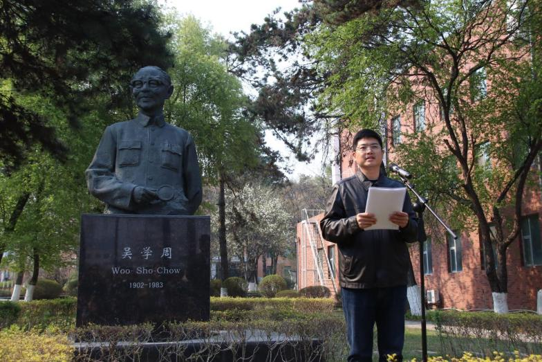 优秀团干部代表刘仕琛同学深情朗诵了中国科学院文联主席郭曰方先生为吴学周院士创作的诗歌——《在科学攻关的征途,你战斗到生命的最后一息》。全体人员在吴学周院士雕像前庄严宣誓,要以吴学周先生为榜样,发奋学习,勇攀高峰,为祖国的科技事业贡献青春力量。