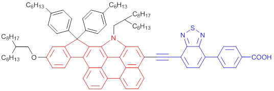 鉴于吡啶钌染料的资源问题与重金属毒性,锌卟啉染料低的制备产率和欠佳的稳定性,开发色彩亮丽、不受资源限制的有机染料是近年来该领域的研究热点,但有机染料的性能迟迟不能取得突破。王鹏课题组开展的这项工作,仅使用单一的有机染料,就可以制备出效率达12.5%的染料敏化太阳电池。该课题组的姚朝阳同学、张敏博士等基于材料计算,设计并合成出完全平面化的电子给体(氮环化的茚并苝,图中红色部分),并通过三键与他们前期(Energy.Environ.Sci.,2013,6,2944;ChemSusChem,2015, 8, 97; Angew. Chem. Int. Ed., 2015, DOI: 10.1002/anie.201501195)研发的苯并噻二唑-苯甲酸(图中蓝色部分)二元电子受体结合,制备出具有自主知识产权的高性能有机染料C275。该研究突破了有机光敏染料的同质研究模式,对于先导发色核的创制具有重要的启示意义。