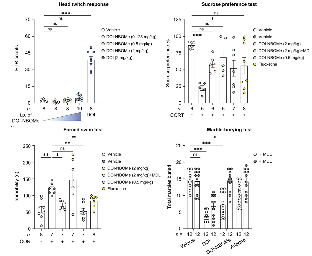 长期以来,经典致幻剂如麦角酸二乙酰胺(LSD)、裸盖菇素(psilocybin)等因其显著的精神活性与治疗潜力间的矛盾而备受关注。尽管临床研究显示这些物质在治疗重度抑郁症、难治性抑郁及焦虑相关疾病方面展现出惊人疗效,但其强烈的致幻副作用始终是阻碍其临床转化的主要障碍。传统理论将5-HT2A受体激活后的Gq信号通路过度激活视为致幻主因,然而这一观点难以完全解释其复杂药理特性。该研究通过整合多维度信号通路分析与前沿结构生物学技术,成功揭示了经典致幻剂作用的新机制。研究团队系统表征了5-HT2A受体激活后触发的下游信号级联反应(图1),首次确证Gi信号通路在致幻剂作用中的关键功能,颠覆了传统认知。研究团队采用单颗粒冷冻电镜技术,成功解析了五种不同配体-受体-G蛋白复合物的高分辨率结构,包括DOI和psilocin结合的5-HT2AR-Gi复合物,以及DOI、ariadne和DOI-NBOMe结合的5-HT2AR-Gq复合物。这些精细结构揭示:配体特异性受体构象是决定G蛋白选择性的关键因素,如同一把钥匙的不同齿形会打开不同的锁。基于这一分子机制,研究团队通过理性药物设计,成功开发出新型5-HT2AR选择性Gq偏好性激动剂DOI-NBOMe(图2)。在临床前模型中,DOI-NBOMe展现出类抗焦虑和类抗抑郁功效,却未诱发致幻样效应(图3),实现了致幻剂的治疗效益与致幻副作用的有效分离;该化合物已由中国科学院长春应用化学研究所与四川大学联合申请专利(CN120204186A)。这项研究不仅为理解致幻剂的作用机制提供了全新理论框架,更开创了基于受体信号偏好性进行精准药物设计的新范式,为开发新一代非致幻型精神疾病治疗药物奠定了坚实基础。