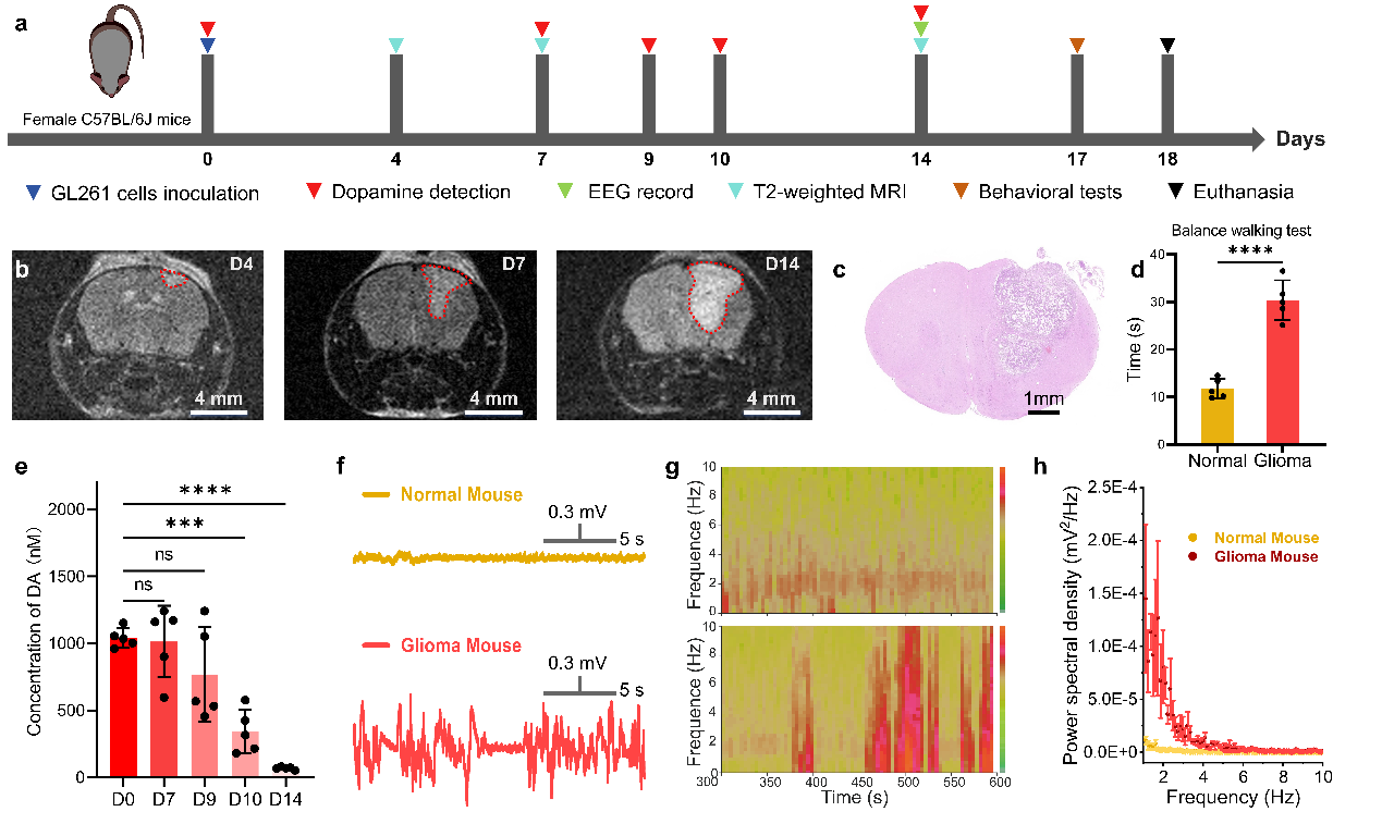 图1. 胶质瘤浸润脑区内多巴胺动态的原位监测及神经电活动分析