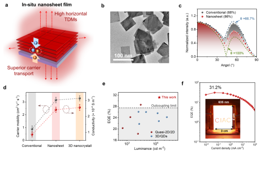 中国科学院长春应用化学研究所在纯红光钙钛矿发光二极管(PeLED)的高效发光研究中取得重要进展。秦川江研究团队提出了一种新型配体工程策略,通过调控结晶动力学,在薄膜中原位构筑了高度取向的准二维钙钛矿纳米片,实现了光学跃迁偶极矩(TDM)的高度水平取向,首次将635 nm纯红光PeLED的外量子效率(EQE)提升至31.2%。相关研究成果以“In-situ formation of oriented perovskite nanosheets with tailored optical dipoles enabling >30% EQE in pure-red LEDs”为题,发表于国际权威光学期刊《Light: Science & Applications》。