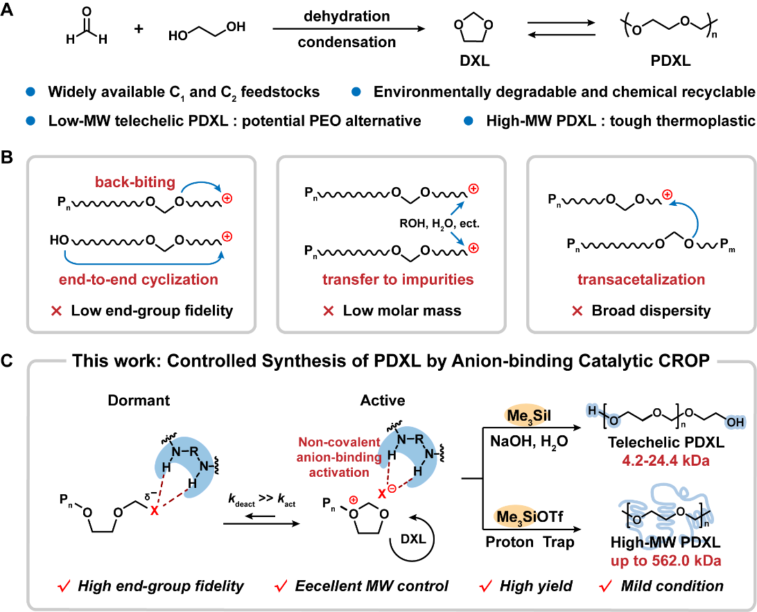 PDXL是一类前景广阔的可化学回收热塑性材料,其单体可来源于廉价且储量丰富的煤化工原料乙二醇和甲醛,且材料本身具有优异的物理性能。尽管相关研究已开展八十余年,合成兼具高链端保真度、分子量可控且结构明确的PDXL,仍然是一项具有挑战性的课题。这主要归因于其活性链末端活性较高,在聚合过程中易引发多种副反应:一是分子内环化,使得聚合物端基不可控,环状与线型产物共存;二是分子间频繁的缩醛交换反应,使聚合产物分散度变宽;三是阳离子活性中心容易向少量醇或者水等杂质链转移,使产物分子量难以提高。因此,开发一个能在温和条件下选择性得到遥爪PDXL和高分子量PDXL的催化体系具有重要意义。